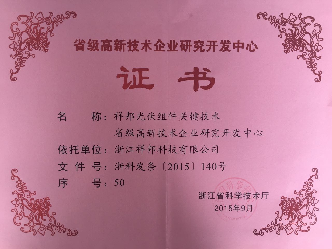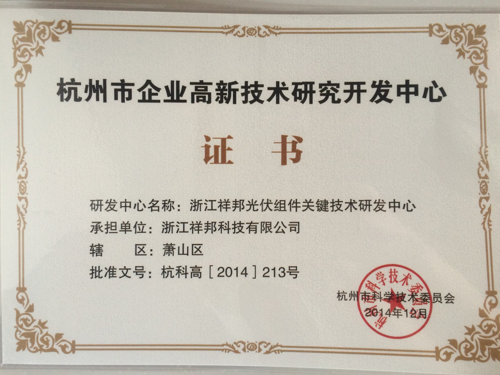 祥邦光伏組件關鍵技術省級高新技術企業研究開發中心